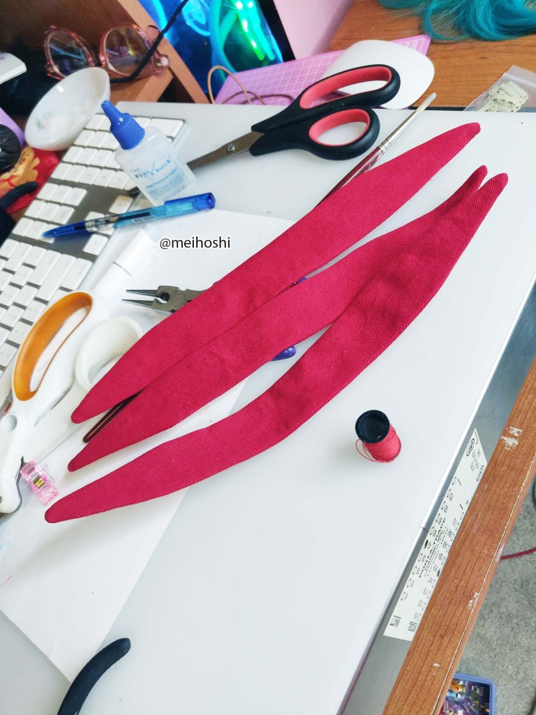 For her hair piece, I used some red fabric I had and made some rectangles that rounded into a point at the ends as shown. I added some wire on the inside to the width of the piece. This was so it could curl it to follow the direction of my head. The fabric I used was already on the stiffer side so I didn’t need to add any interfacing or make the wire into the shape of the hair piece. I had the wire on hand, but you want to use a gauge that’s high enough that it will hold it’s shape and not warp. I used a round-nose plier to make a circle at the two ends to secure it and so it couldn’t accidentally poke through the fabric. I didn’t sew the wire end to the fabric because if you make it the same size or even a pinch bigger, it should fit snugly.