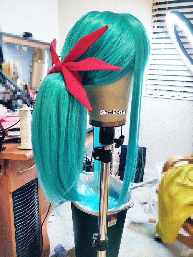 The wig I purchased off Amazon. I wanted to get one from Arda but they were on backorder at the time and I didn’t want to wait because I was also buying my Botan wig at the same time. I bought the wig from ROLECOS and was surprisingly impressed with the quality. It was very soft and quite thick; I had to even cut some of the volume out when I was doing the ponytail. Even though it said, “Prime,” it was being shipped out of China so it took a few weeks to receive. Maybe Amazon has some in stock now, but the one I purchased took a while. The wig is definitely teal like how they show it, but sometimes flares blue in photos.