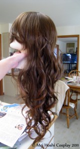 Edit: Since writing this post, I ended up going back and redoing her wig, which I highly never recommend. Taking apart the wig after I had hot glued it together was tedious. Fortunately the wig was heat resistant, so I was able to just straighten the ends that looked wonky. It ended up looking way better and should hopefully fit better. Unfortunately you can see some of the glue parts from the previous version, but it’s whatever. I used clear caulk this time with minimal hot glue. I cut the bangs shorter and restyled them. Kids, never take a somewhat styled wig and just toss it in a wig bag LOL. I tried the crimping method on the side pieces and I’m not sure I like them. I think the wig fibers are too silky/soft so it was hard to tease without just combing it all out. Last wig pic is the new one!